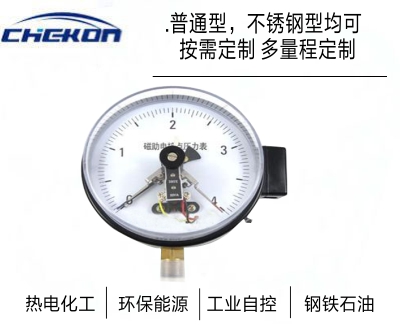 YXC系列磁助電接點(diǎn)壓力表廣泛應(yīng)用于石油、化工、冶金、電站等工業(yè)部門(mén)或機(jī)電設(shè)備配套中測(cè)量無(wú)爆炸危險(xiǎn)的各種流體介質(zhì)的壓力。通常,以表經(jīng)與相應(yīng)的電氣器件(如繼電器及接觸器等)配套使用,即可對(duì)被測(cè)(控)壓力系統(tǒng)實(shí)現(xiàn)自動(dòng)控制和發(fā)信(報(bào)警)的目的.