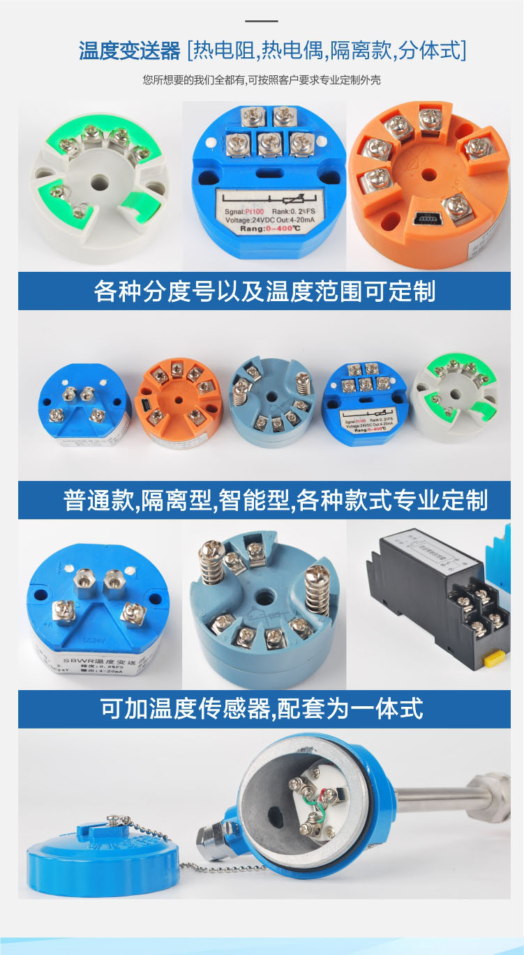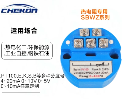 現(xiàn)場安裝在熱電偶、熱電阻的接線盒內使用,直接輸出4-20mA、0-10mA的輸出信號。這樣既節(jié)約了昂貴的補償導線費用,又提高了信號遠距離傳輸過程中的抗干擾能力;